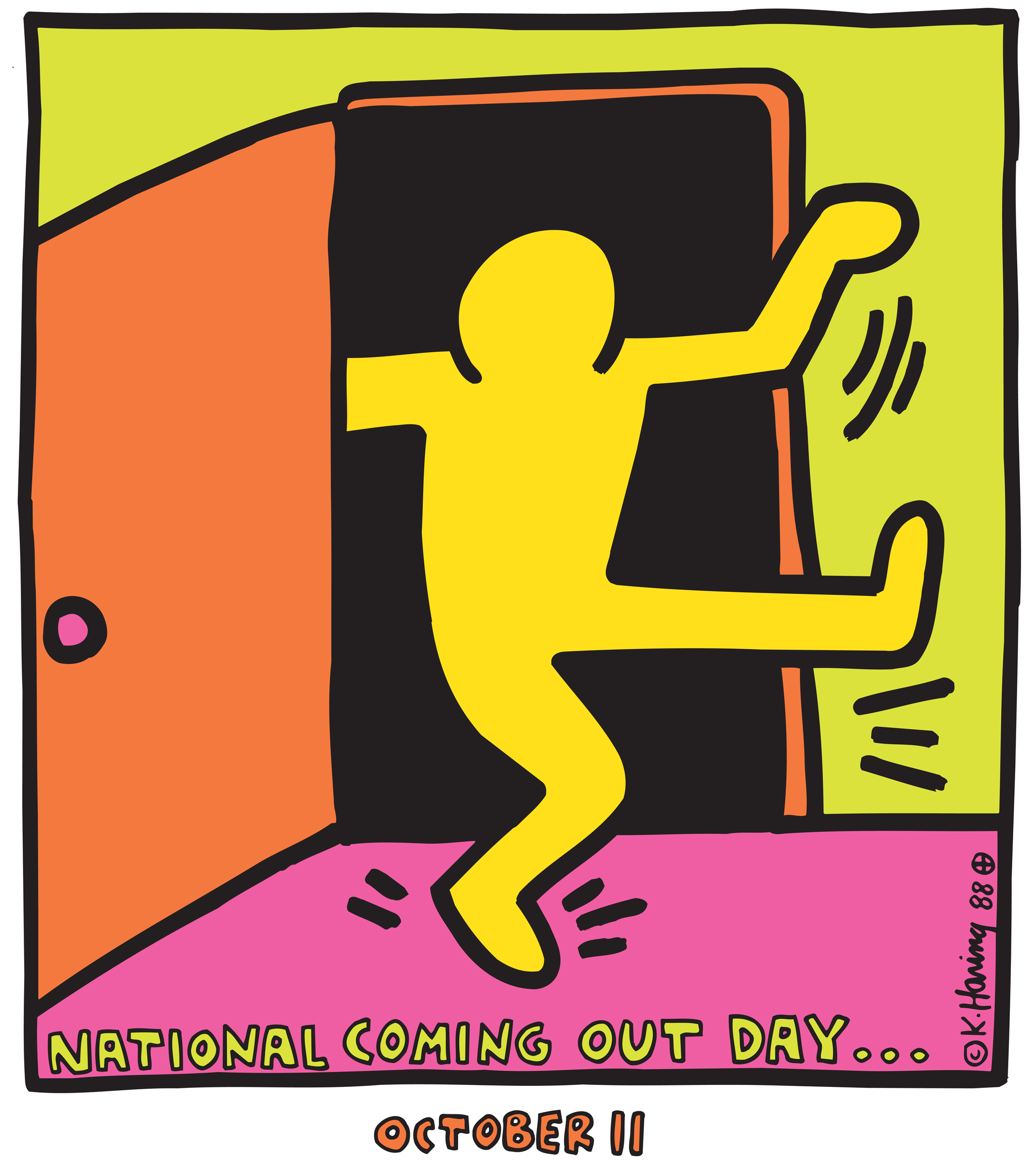 Keith Haring designed the first National Coming Out Day logo in 1988. Haring was a gay American artist whose pop art style emerged from the New York City graffiti subculture of the 1980s.