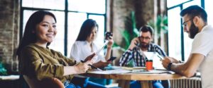 • A group in discussion around a desk.